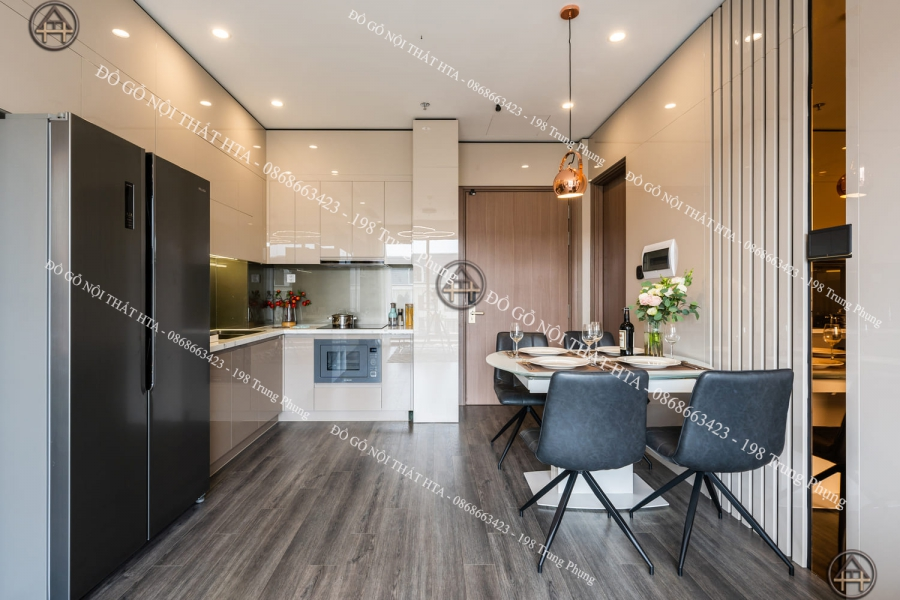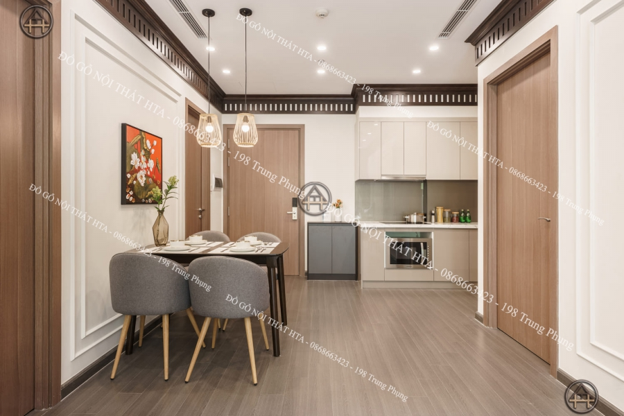 Về chất liệu, bàn ăn có thể làm từ gỗ tự nhiên hoặc gỗ công nghiệp kết hợp chân kim loại, hoặc mặt kính nếu muốn không gian nhẹ nhàng và hiện đại hơn. Màu sắc bàn ăn nên đồng bộ hoặc tương phản nhẹ với tủ bếp để tạo điểm nhấn thẩm mỹ. HTA thường kết hợp bàn ăn đồng bộ trong combo tủ bếp ở các dự án căn hộ, ví dụ như Combo nội thất chung cư 98m², giúp tổng thể không gian vừa tiện nghi, vừa hài hòa.