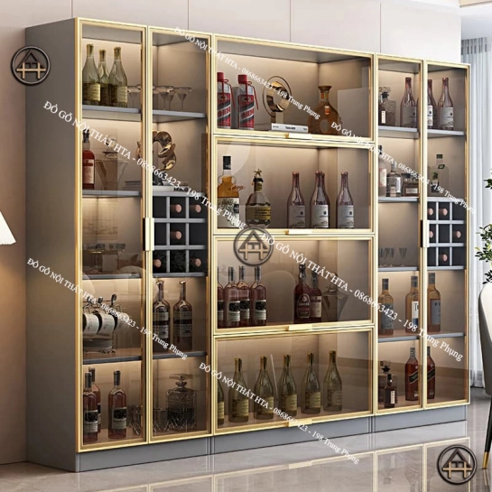 Phòng khách lớn luôn phù hợp để đặt tủ rượu hoặc tủ trưng bày sang trọng. Tủ rượu trong phòng khách lớn không chỉ là nội thất mà còn là “tuyên ngôn sang trọng” của gia chủ. Những mẫu cao 1m8–2m4 giúp làm đầy không gian và tăng tính nghệ thuật.